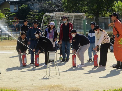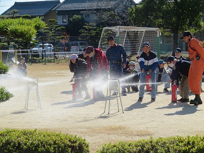 避難訓練の後、6年生は消火体験を行いました。愛西市消防署の方から水消火器の使い方の説明を聞きました。水消火器を使って、火の的に水を当てるという、消火体験をしました。水消火器は重く、消火器を持ち上げて的に当てることは、難しかったようです。