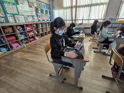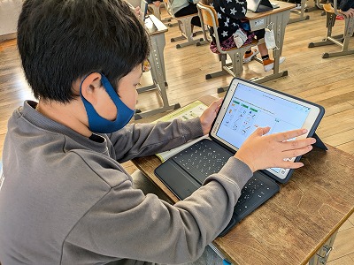 タブレットを使って何やらおもしろそうなことをやっています。いろいろな楽器の絵をタップすると、その楽器の音色を聞くことができます。学校にはない楽器もあり、とても便利です。今日は、いろいろな楽器の音色を聞いて、その特徴を「長い・短い」「かたい・やわらかい」に仲間分けします。端末上なので、楽器の絵を表に動かすだけで、仲間分けができます。なんと便利!!