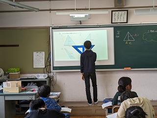 三角形の面積の公式を学習していました。いろいろな形の三角形の面積を考えます。公式を使うためには、「底辺」「高さ」がどこになるかを理解しないといけません。三角形を見る向きを変えて「底辺」「高さ」を見つけます。