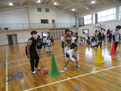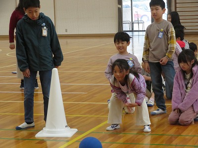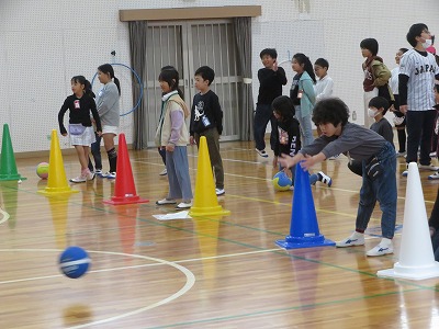一人2投。ピンまで距離があるけれど、みんな、ルールを守って、上手に両手で転がします。