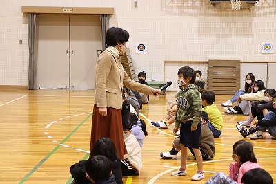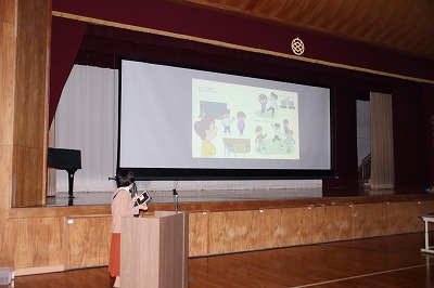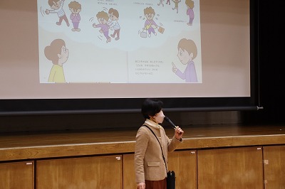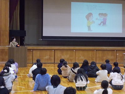 絵本「いじめ、みちゃった!」の読み聞かせをしてくださいました。「どこからいじめ?」「いじめを見たら、いじめにあったりしたら、どうしたらいい?」などの疑問に答えるような絵本でした。考え方を変えること、シンキングエラーを正すことや、いじめをふせぐ合言葉「なれる・すけて」の行動をとることが大切というお話でした。