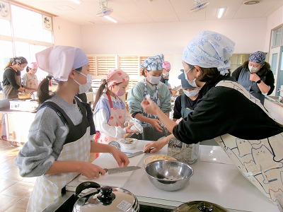 ごはんは、先日の五平もちづくりでは炊飯器でご飯を炊きましたが、今回は、お鍋で炊きます。お米のとぎ方、お鍋の火加減や、包丁の使い方などを、立南っ子サポーターの方に教えていただきました。