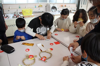 蒸しあがるまでの時間は、しめ縄づくりの仕上げです。折り紙で達磨を作りました。