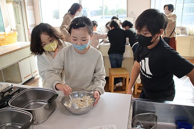 さつまいもと、牛乳、パンケーキの素を入れて混ぜるだけです。さっくりと、みんなが混ぜることを体験しました。あとは、型に入れて蒸し器で蒸すだけです。