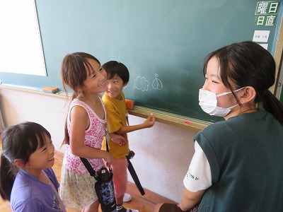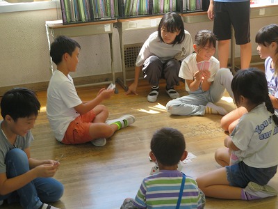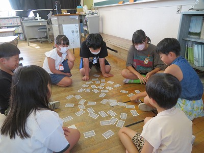 熱中症警戒アラートが出ていたため、今日の青空タイムはすべての班が室内で楽しめる遊びを6年生が計画しました。絵しりとり、宝探し、ババ抜き、フルーツバスケットなど、久々に6学年混じっての活動に、笑顔があふれました。