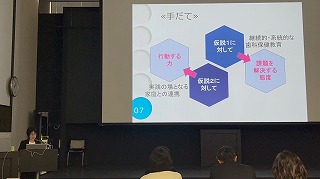 授与式の後には、本校の養護教諭である伊藤先生が『歯や口の健康状態を理解し、自ら課題を見つけて、進んで健康づくりに取り組むことができる児童の育成 ~「バトンタッチ運動」の取組を通して~』という演題で研究発表をしました。