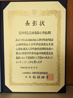 本校は、タイトルにもある「第62回全日本学校歯科保健優良校 奨励賞」を受賞し、その授与式が研究大会の中で行われました。学校を代表して、校長がこの授与式に出席しました。この賞は、児童の歯と口の健康づくりとともに、学校ならびに地域の歯科保健に対する理解と関心を高め、学校歯科保健の振興と充実を図る目的で行われており、本校の取組が、認められ表彰されました。