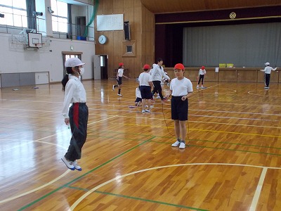 4年生は今日の体育で、なわとびに取り組んでいました。3人一組になって、とぶ人と数える人に役割分担をして、チャレンジです。まずは「前とび100回」のクリアをめざします。それをクリアできたら、挑戦したい跳び方の練習です。
