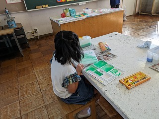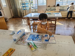 水と絵の具のわりあいを変えて1色で塗りました。1色でもいろいろな色合いが出て、楽しいですね。