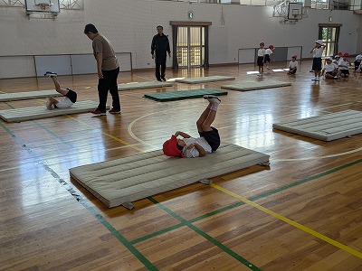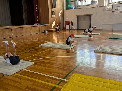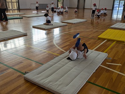1・2年生の体育です。マットあそびを行っています。今日は転がり遊びをしました。丸太転がり、前転がり、後ろ転がりをしました。前回の体育でも行いましたが、随分、上手に転がることができました。