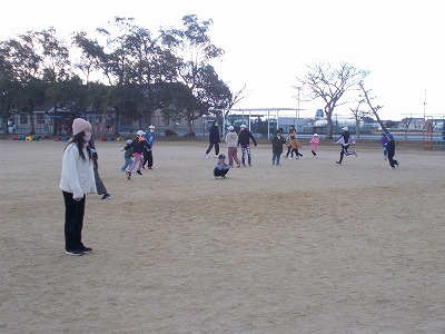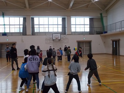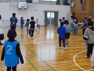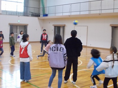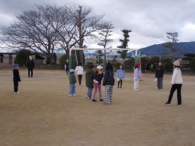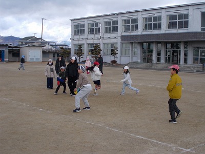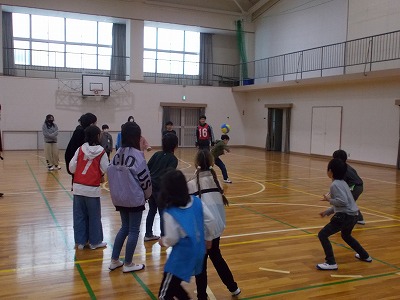 運動場では、1班と3班が鬼ごっこ、2班と4班がノーマルなドッジボールをそれぞれ合同で楽しんでいました。時折雪がちらつく寒い日でしたが、どの子も元気にあおぞら班活動に取り組んでいました。