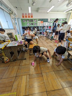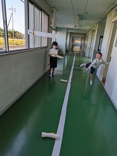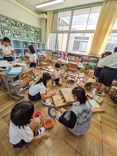 2年松組の生活科の授業の様子です。「おもちゃランド」で使うおもちゃ作りの続きです。「今日で完成ですよ」という担任の先生の言葉に、早く作りたくて、みんながそわそわ…。できた人は、おもちゃを試すこともしました。