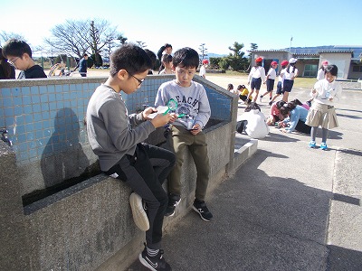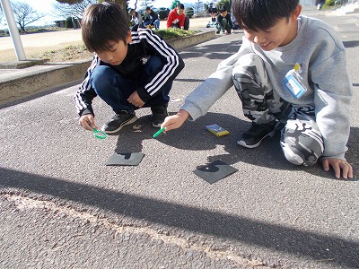 「こんなふうになったよ」「けむりが出た~」「さわると、あたたかいね」などと、大喜びです。授業の終わりのチャイムが鳴っても、作業をやめません。「休み時間もやってもいいよ」とう先生の言葉に子どもたちは、もくもくと太陽の光を集めていました。