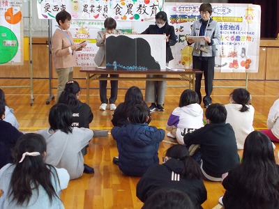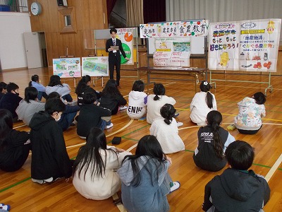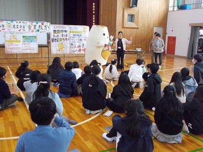 その後は、愛西市消防署の方に水消火器の使い方を教えていただきました。6年生が代表で実際に水消火器の体験を行いました。