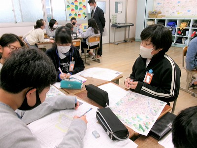 今日は、修学旅行当日にお世話になる旅行会社の方々に来ていただき、分散学習の行程の組み方の学習を行いました。