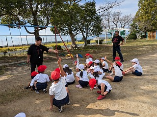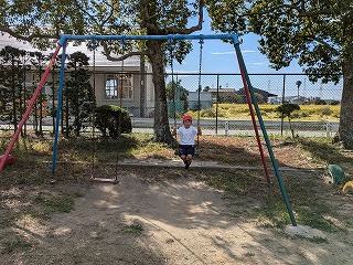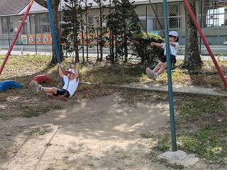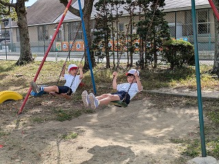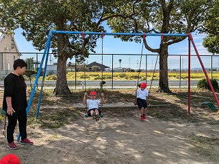 まずは、スタートの位置を確認し、ブランコのこぎ方、止まり方などの注意を聞き、実際にブランコに乗りました。全員がブランコに乗り終わったところで、上手にブランコをこいでいた人を発表しました。