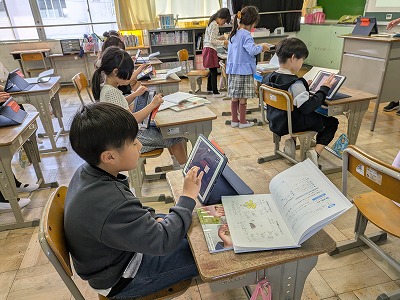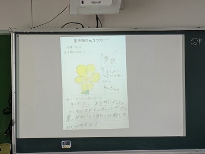 観察記録を写真に撮って、「ロイロノート」というアプリを使って、先生に提出しました。観察したことを発表し合いました。観察した生き物を比べ、生き物は、色や形、大きさなど姿が違うことをまとめました。