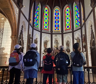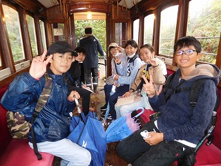 雨が降る中、グループごとで明治村を回りました。市電やSLに乗ったり、文明開化を感じる明治時代ならではの建築物を見学したりしました。晴れていたら、紅葉もきれいに見れたのに…。仲間といっしょだったので、楽しく見学することができました。