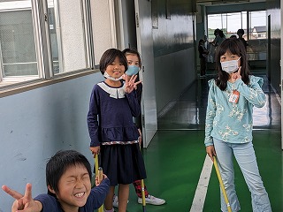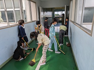 今日、「この指とまれ!プロジェクト」が3年生の子の発案で行われました。渡り廊下をほうきで掃き掃除をするという内容でした。