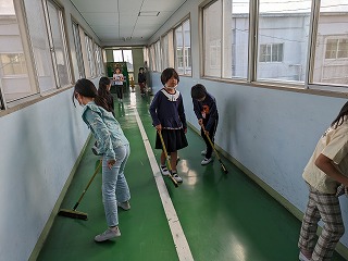昼休みの時間にほうきを持って、数人集まってきました。早速、渡り廊下をほうきで掃き掃除をしました。