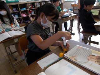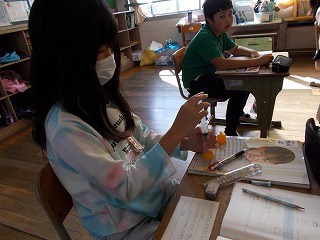 「とじこめた空気と水」の学習をしています。前時にやってみた空気鉄砲の玉がなぜ、飛んだのかを考え、「とじこめた空気は、おされるとどうなるのだろうか」について実験をしました。まずは、注射器のピストンを引いて注射器の筒の中に空気を入れます。次に筒の先を押さえて、空気を閉じ込めます。ピストンを、指でゆっくりと押し、空気の体積と手ごたえの変わり方を調べました。