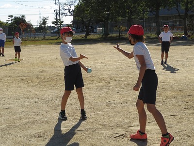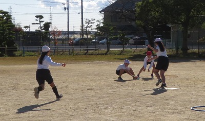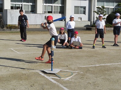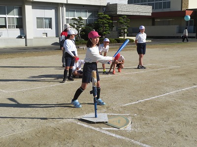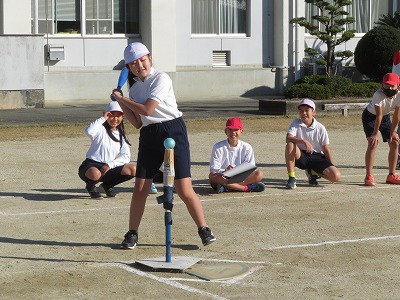 ティーボールの試合中の5年生。守備チームがボールをとって近くのフラフープに入るまでに、ボールを打ったバッターが何塁までベースを回れたかで得点が入ります。打席を重ねるごとに、「オ~!」という歓声や、「走れ、走れ~!」「あっちへねらって~!」などの応援やアドバイスの声が響きました!守備も攻撃も、チームでの協力がカギですね。今回の試合を振り返って、次回さらに得点を重ねたり、阻止したりできるよう、チームで作戦を立てて試合に臨みましょう!