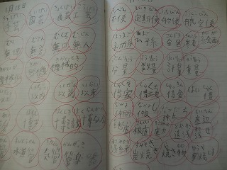 担任の先生から、50点アップの児童や漢字が苦手でいつもはあまり点が取れない児童のことを教えてもらいました。その児童のテストを見ると、二人とも素晴らしい成績です。「どうやって勉強したの?」と尋ねると、自主勉強ノートを見せてくれました。そのノートにはたくさんの漢字が書いてありました。そして自分で丸を付け、テスト形式で行った努力の跡が見られます。