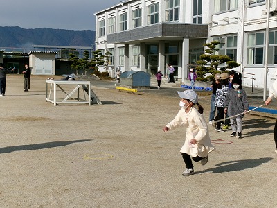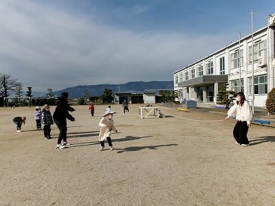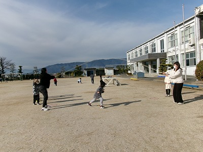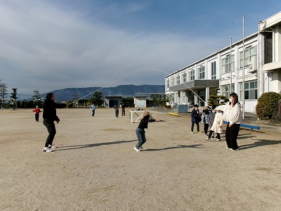 地域の方お二人にお越しいただき、しめ縄のもととなる「縄ない」を教えていただきました。手を濡らし、両手でこするようにしていくと、縄ができてきます。講師の方がやってみせてくださいました。とても簡単そうに縄ができていきます。いざ、子どもたちがやり始めると、わらがちぎれてしまいます。それでも、皆で協力したり、講師の方々にアドバイスをもらったりしながら、「縄ない」をして縄を完成しました。完成した縄を丸くして折り紙で作っただるまを付けて、しめ縄の完成です。2つも3つも作っている子もいました。出来上がったしめ縄を家に持ち帰りました。