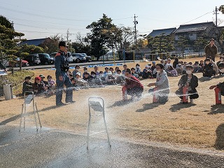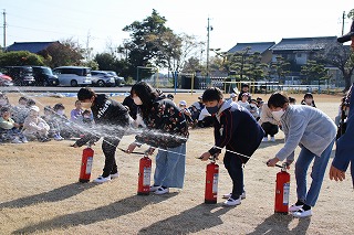 その後、場所を移動して、6年生による消火訓練を行いました。まずは、愛西市消防署員の方より、「水消火器の使い方」を説明していただきました。その後、6年松組の皆さんが、水消火器を使った消火訓練しました。