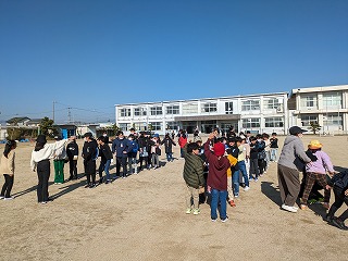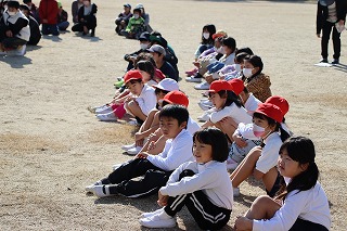 運動場で遊んでいた児童の皆さんは、サイレンが鳴ると、遊ぶのをやめて、運動場の真ん中に集まってしゃがんでいました。多分、地震だと思ったのでしょう。すばらしい動きです。火災だと分かり、校舎内にいた皆さんは運動場に出て、避難しました。無事、全員避難できました。