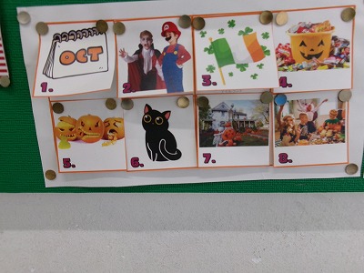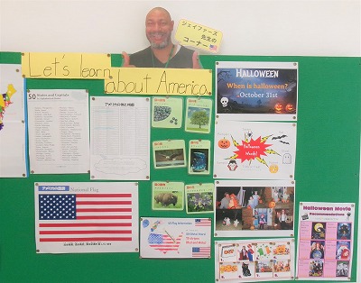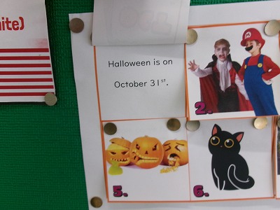 夏休み明けの9月の始めに早速、ジェイファーズ先生が一生懸命、作成してみえました。「ハロウィン」に関するものに変わっています。ハロウィンのことがよく分かる掲示物になっていますので、皆さんも見てくださいね。