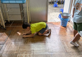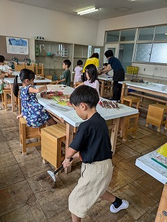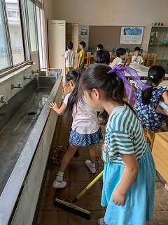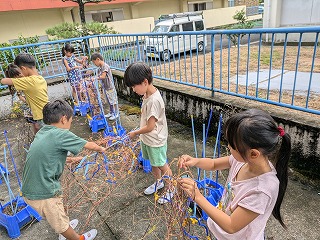 まずは、支柱からアサガオのつるを取ります。悪銭苦闘!つるが、からまって支柱からなかなか取れません。助け合ってなんとか全員つるを支柱から外すことができました。次に持ってきたモールやリボンを使って、つるを輪っかにしてリースにしました。リースができた人は、図工室の片づけをします。進んで箒を使って床掃除をする人、箒がなければ、手でゴミを拾ったり、椅子を動かしたり…。みんなできれいに片づけをしました。
