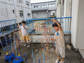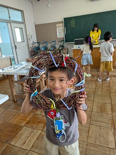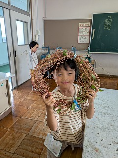 1年生は、アサガオのつるを使ってリース作りをしました。夏休み中、家庭に持ち帰り世話をしたアサガオ。9月になり、学校が始まってもまだ、花を咲かせているアサガオもありましたが、ようやくリース作りができるくらいにつるが枯れてきました。