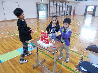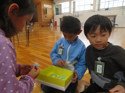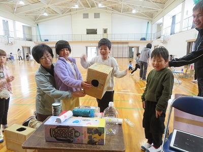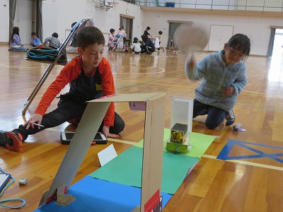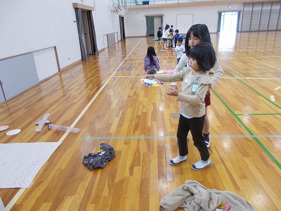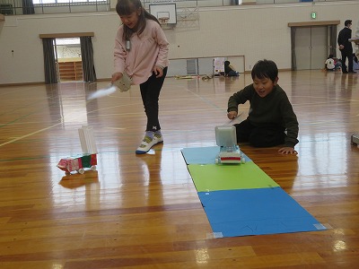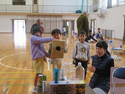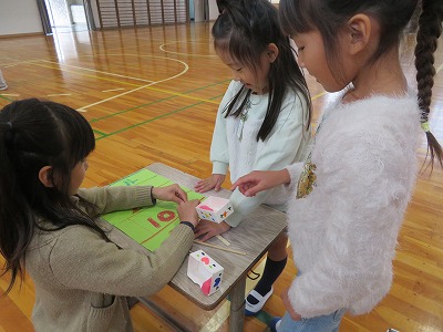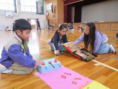 2年生が1年生をおもちゃランドに招待しました。2年生のおもちゃは、紙コップや傘袋、食品トレイ、段ボール、紙皿など、身近な材料で作った工夫いっぱいの手作りのおもちゃです。2年生は、自分の作ったおもちゃを、自分で説明したルールや遊び方で遊んでもらい、タブレットで制限時間を示したり、手書きの点数表などに記録するのも、すべて一人一人が行いました。2年生の説明をよく聞いて、1年生は時間いっぱい何度も何度も挑戦したり、遊んだりでき、とっても嬉しそうでした。