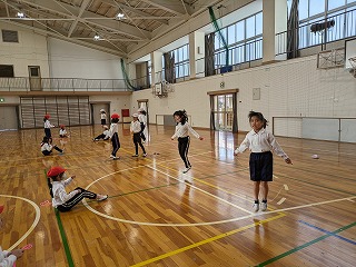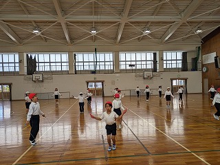 2年松組の体育の授業の様子です。縄跳びを使って、「前跳び」をしました。50回跳ぶことを目標に頑張りました。1分間、縄に引っかからずに跳び続ける練習をしました。来年の1月に行われる「なわとび集会」に向けて、みんな、頑張っています。
