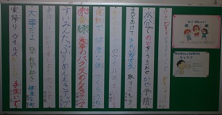 保健室前の掲示板です。保健委員会では、インフルエンザやコロナなど、いろいろな感染症から身を守るための標語を作成しました。作成した標語が貼ってあります。ぜひ、実践して、さまざまな感染症から身を守りましょう!