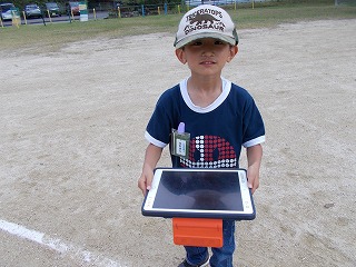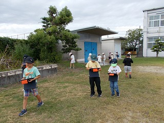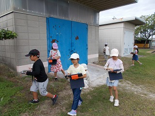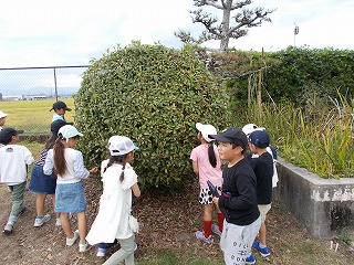 1年生の生活科で「あきを みつけよう」という学習をしています。運動場に出て、見つけた秋をタブレット端末で写真を撮っています。