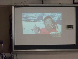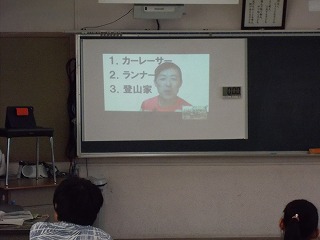 世界を舞台に、一週間走り続け、約250㎞を走り切るレースに参加されているそうです。砂漠を走ったり、南極を走ったりしたときの様子を写真で紹介してくださいました。砂漠では星がとてもきれいだったこと、南極では、条約によって野生動物には5m以内に近づいてはいけないことを話していただきました。子どもたちは興味津々!!