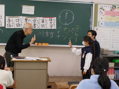子どもたちは、栄養教諭の先生が持ってきた布製の「お米」が、籾がついた状態から、玄米、胚芽米、白米へと変身していく様にとても興味をもったようです。