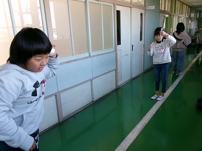 「訓練!訓練!運動場に避難してください」というアナウンスで、外で遊んでいる子は運動場の真ん中で集まり、校舎内にいる子は先生たちの指示にしたがって運動場に避難しました。静かに素早く行動できました。また、火災ということで、ハンカチや手で口元を押さえる子もいました。