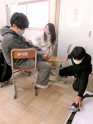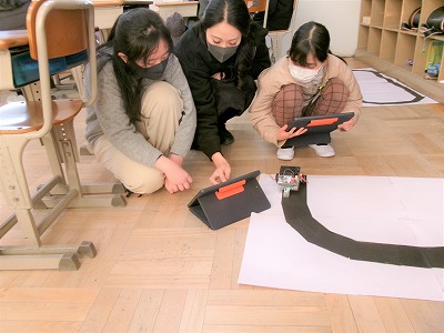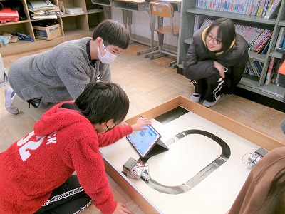 6年生の総合的な学習の時間では、「アーテックロボ」に取り組んでいます。ロボットを操作するためのプログラミングを組んでいきます。黒い線に沿って、ロボットが動くようにしていきますが、これがなかなか難しいようです。それぞれのペアやグループで、いろいろと試行錯誤しています。ICT支援員の方にもアドバイスをもらいながら、取り組んでいます。