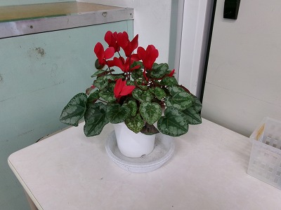 近隣の鉢花農家さんより、赤やピンクのシクラメンをいただきました。