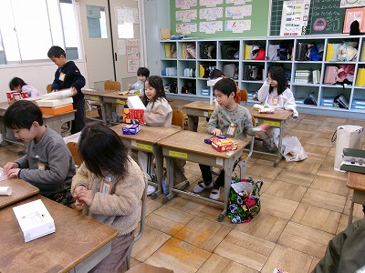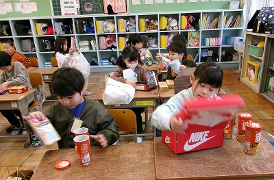 おうちの方が、この図工のためにいろいろな形のの箱を用意してくださいました。子どもたちは、持ってきた箱を積んだり、並べたりして、どんな形になるか、いろいろ試していました。
