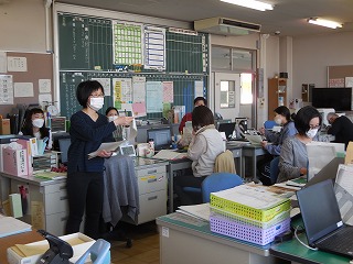 昼放課に教室で蕁麻疹が顔や腕に見られ、担任に申し出た児童(保健調査などで保護者からの食物アレルギーの申し出はない児童)への対応について、実際に教室と職員室と分かれて行いました。シミュレーションをする中で、こういう場合はどうしていくとよいかという疑問が出され、共通理解を図りました。