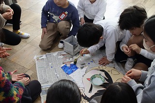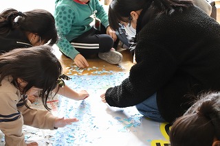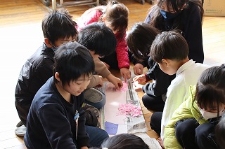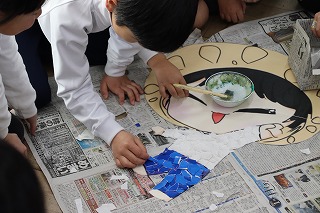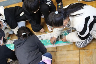 今日の青空班活動は、児童玄関の掲示物をみんなで作ることでした。絵をいくつかのパーツに分けて、青空班で分担してそれぞれのパーツを完成させます。折り紙を使ってちぎり絵で完成させます。出来上がりが楽しみです。