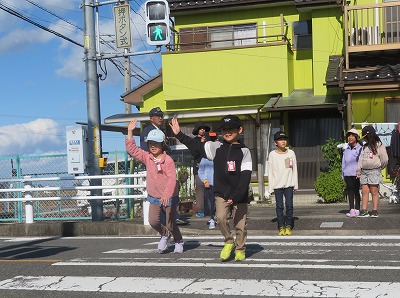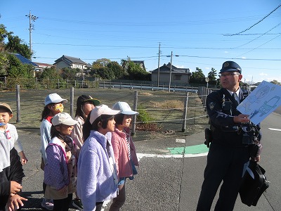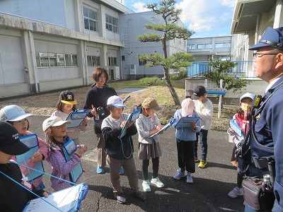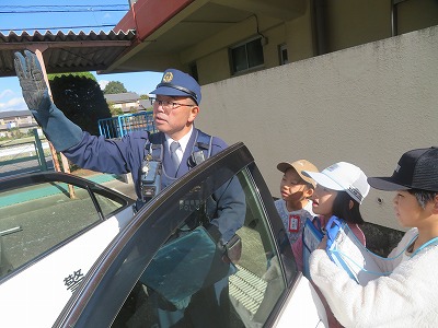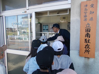 今日は立田南駐在所の警察官を講師にお招きし、久々の町探検「駐在所見学」を行いました。駐在所へ向かいながら、駐在さんから、学校の周りの危険やその回避の仕方を教わりました。これまで駐在所に入ったことのなかった子どもたちは興味津々。駐在さんがいないときでも、ここにある電話から110をかければ、名古屋市の通信指令室につながることも学びました。パトカーに積んであるさすまたや「止まれ」の旗、コーンなどの使い方もわかりました。パトカーにも乗せていただきました。知りたかった警察官の仕事や駐在さんの暮らしなどの質問にもたくさん答えていただきました。なんともワクワクドキドキいっぱいの1時間。