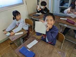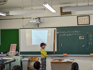 2年松組の算数の授業の様子です。単元「長方形と正方形」の学習をしています。今日は、長方形の紙を切って、できる四角形について
