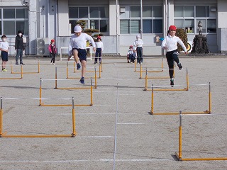3年松組の体育の授業の様子です。ハードル走を行いました。リズムよく、3歩で跳べるように、それぞれ練習をしました。