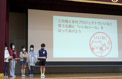 「この指とまれ!プロジェクト」の活動をいよいよ開始します。今年の「この指とまれ!プロジェクト」は、掲示板を見て「いいな」と思う企画や参加してよかったと思う企画に、ぜひ称賛の意味を込めて「いいね!」シールを貼るということが新しく増えました。「皆さんの楽しい企画、学校のためになる企画を待ってまーす」というお話でした。