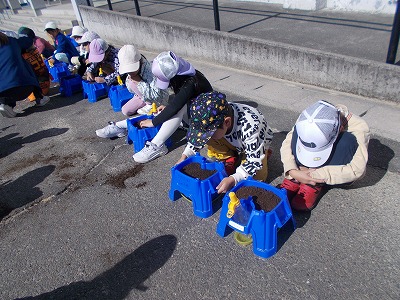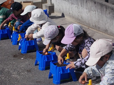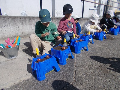 今日は、チューリップの球根を植えます。アサガオに使っていた鉢に、新しい土を入れました。土を入れたら、鉢を軽くたたいて土をならします。その後、4種類の球根から2つ選んで、自分の鉢に植えました。子どもたちは、「さいた~、さいた~、チューリップのはなが…」と歌をうたいながら球根を植えていました。